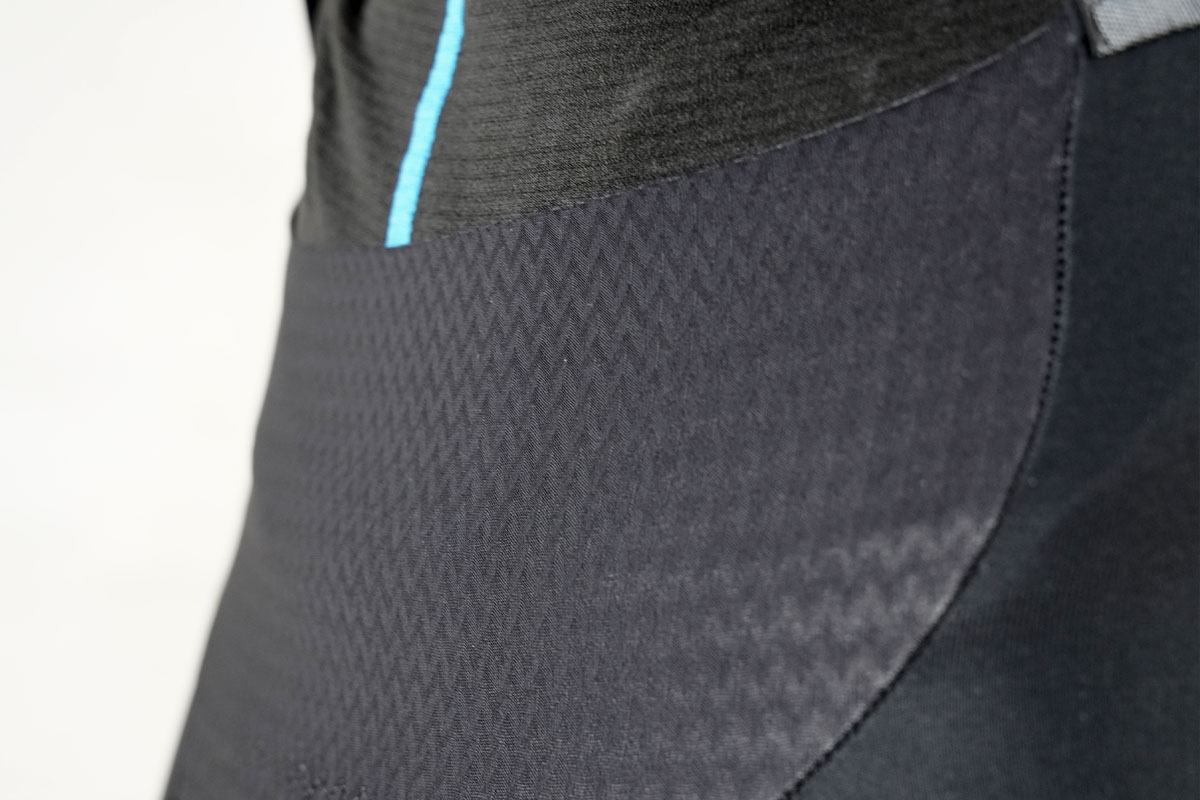 腹部と膝は、体温が下がりすぎるとライドパフォーマンスの低下の原因になるためジャケットと同じ防風素材「AIRBLOCK.888」を使用し冷たい風が内部に入らないように工夫をしています。