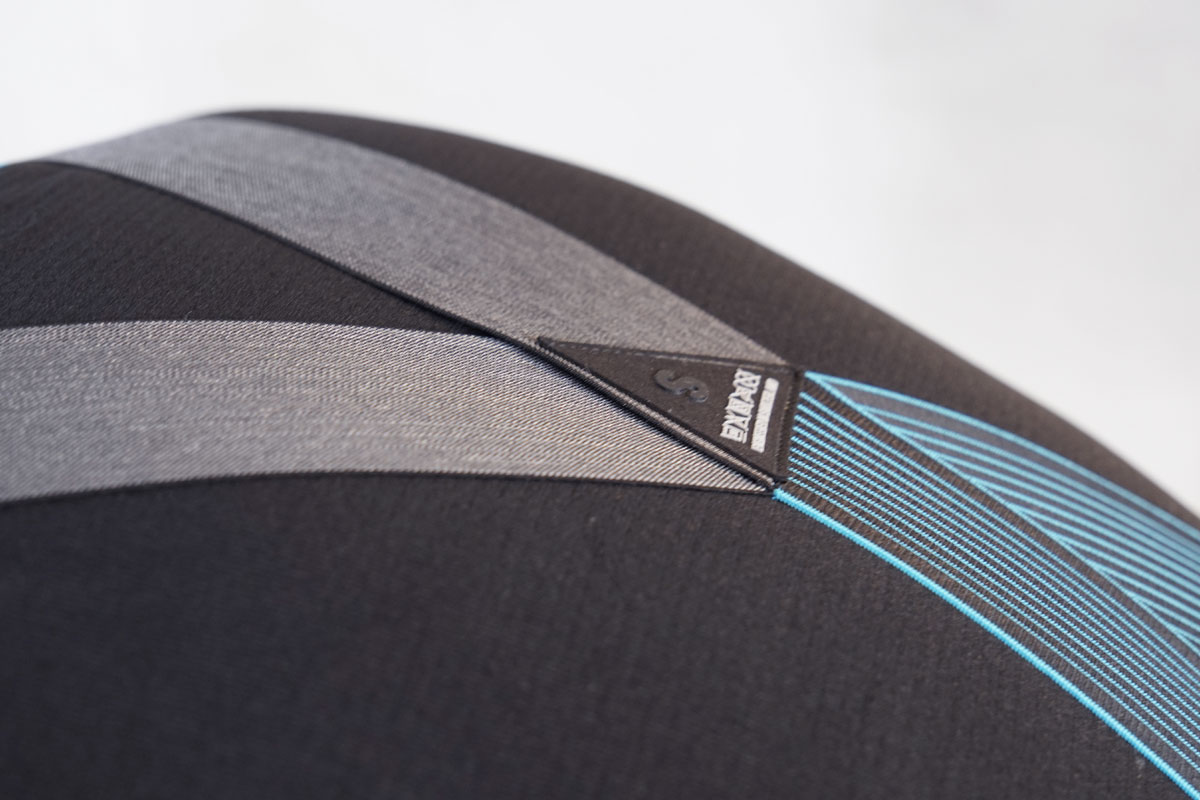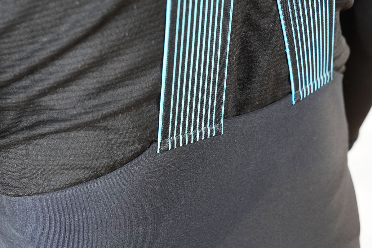ビブストラップ上部は伸縮性が高く体へのストレスを軽減し、腰側の黒と青の部分に伸縮性がなくペダリング時に起こる生地のたるみを抑えます。