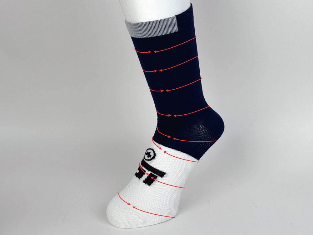 ハイコンプレッションソックスは主にレース系のモデルやスピードを求める系のモデルに多く採用されており、コンプレッションを高め血行をよくするのと同時に足にピッタリ密着することでエアロ効果を高めています。