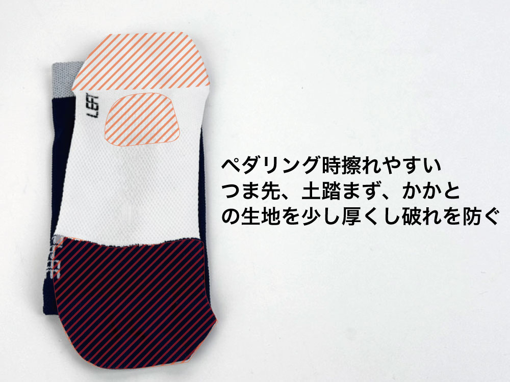 擦れる場所が異なるためそれぞれの対策が異なり、一般的なソックスを自転車で使用すると踵や母指球辺りが生地が摩擦薄くなり破れやすいです。