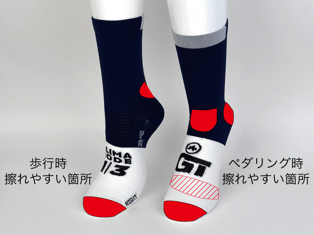 歩く動きとペダリングの動きではシューズとソックスの擦れ合う位置が異なります。