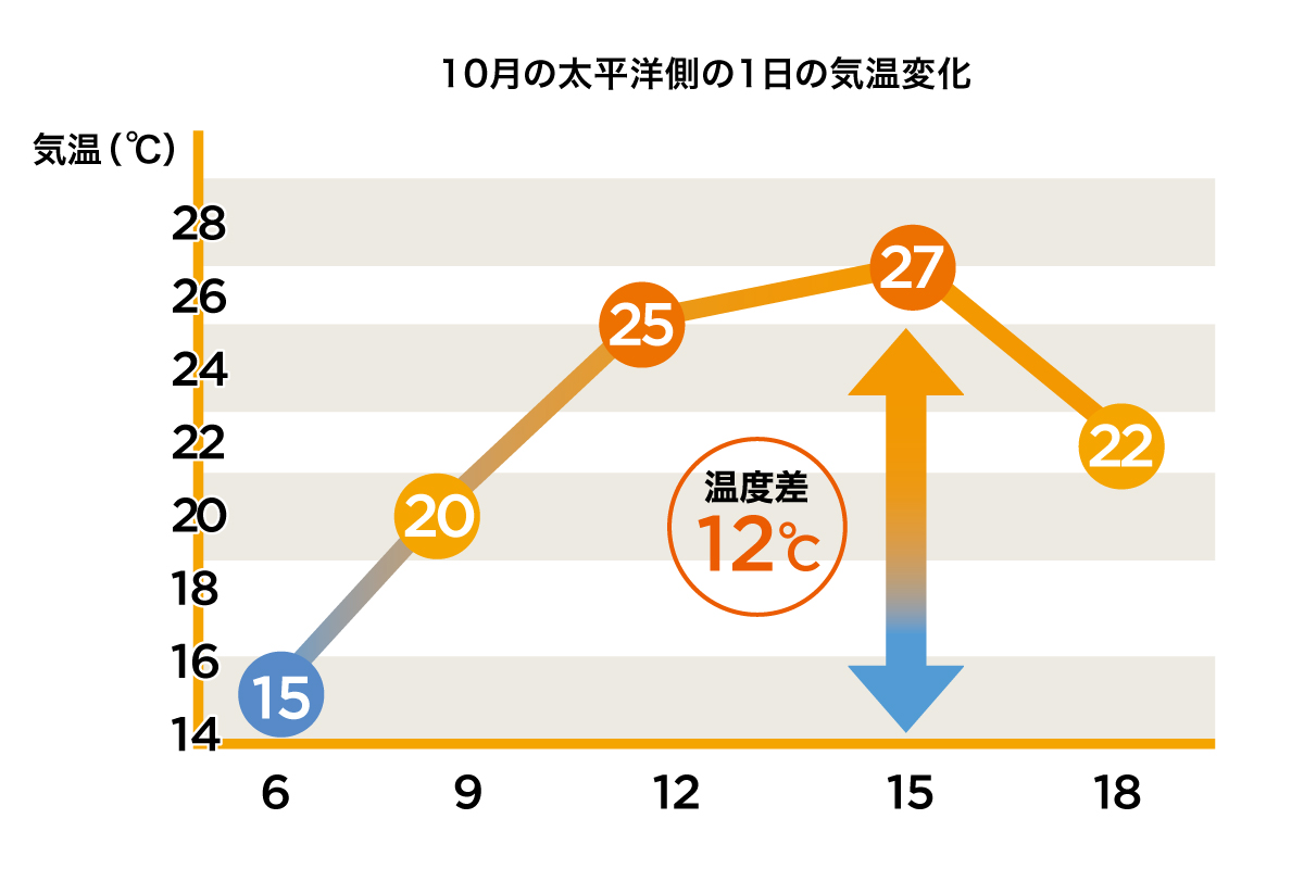 早朝は肌寒く、日中は、半袖でもライディングできるほど暑くなることも。