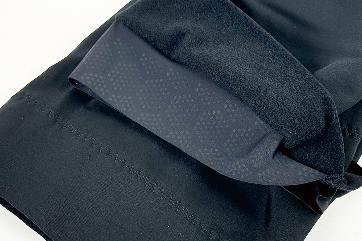 裏起毛素材に撥水加工をほどこした、ヘビーな素材で構成。カットラインが折り返しの無いレーザーカットになっており、エアロ効果を高めるため、ウェアとの段差がないように工夫されています。