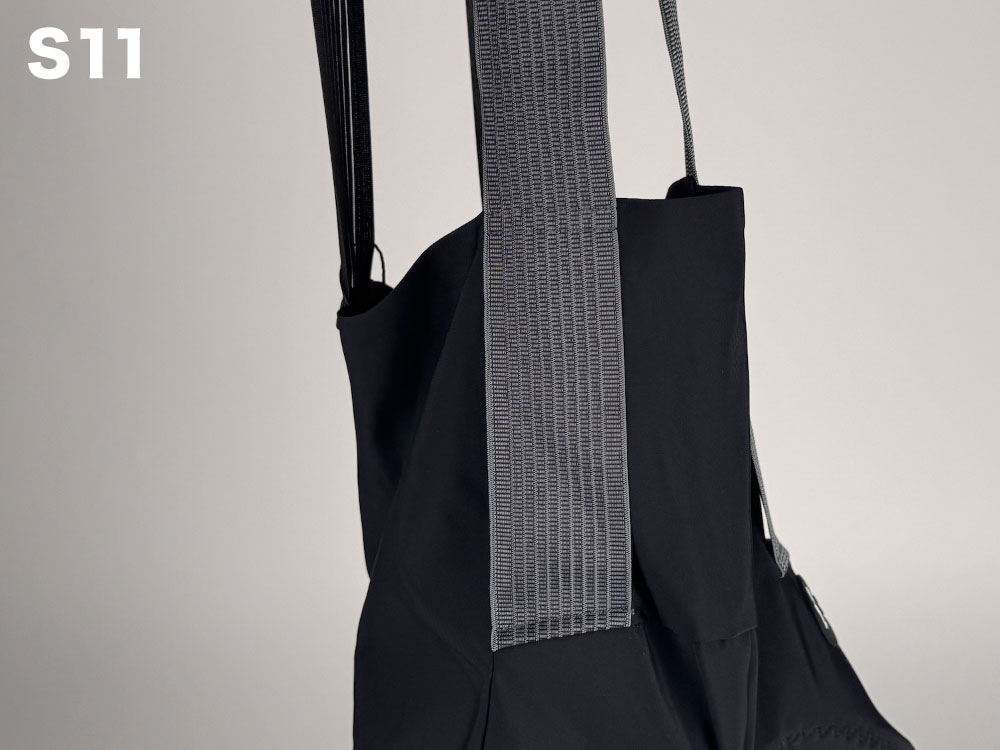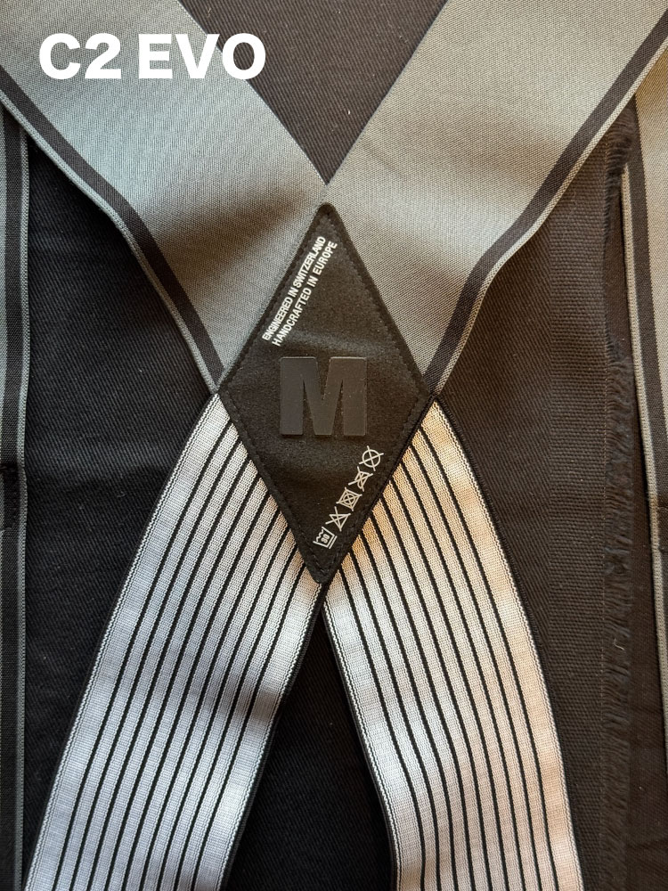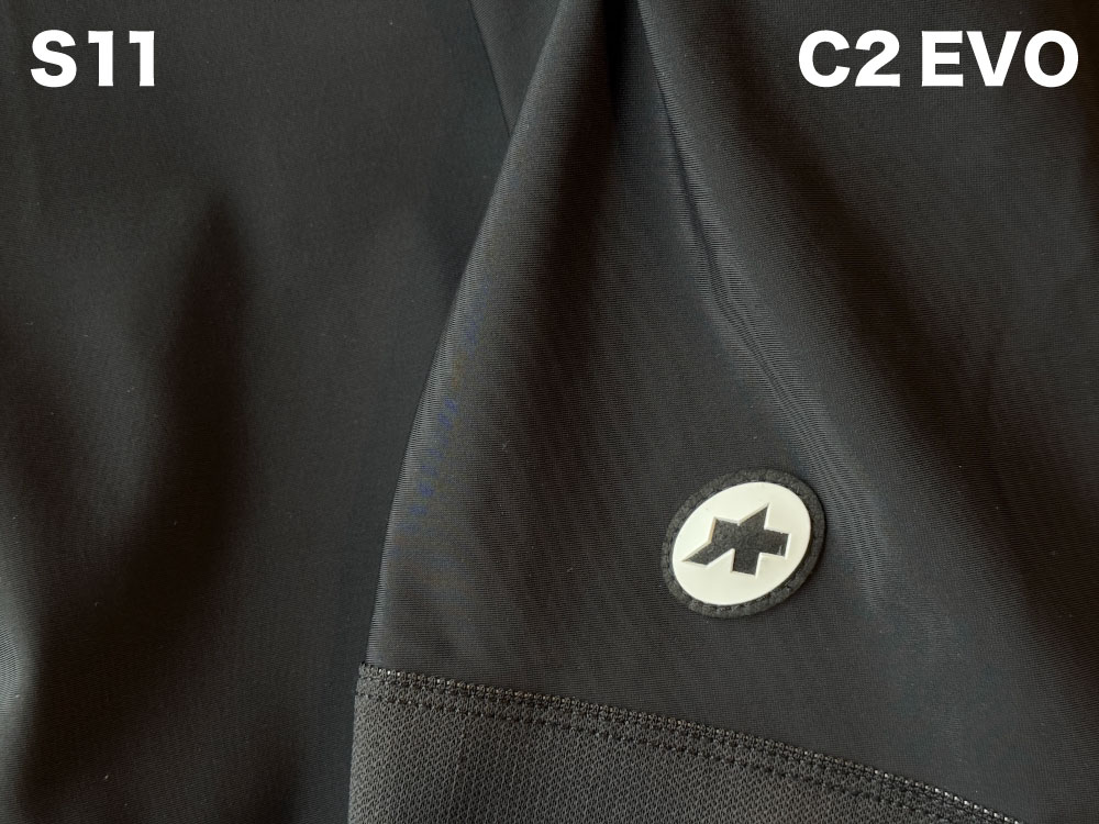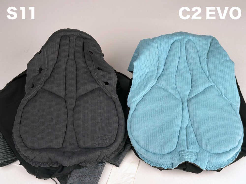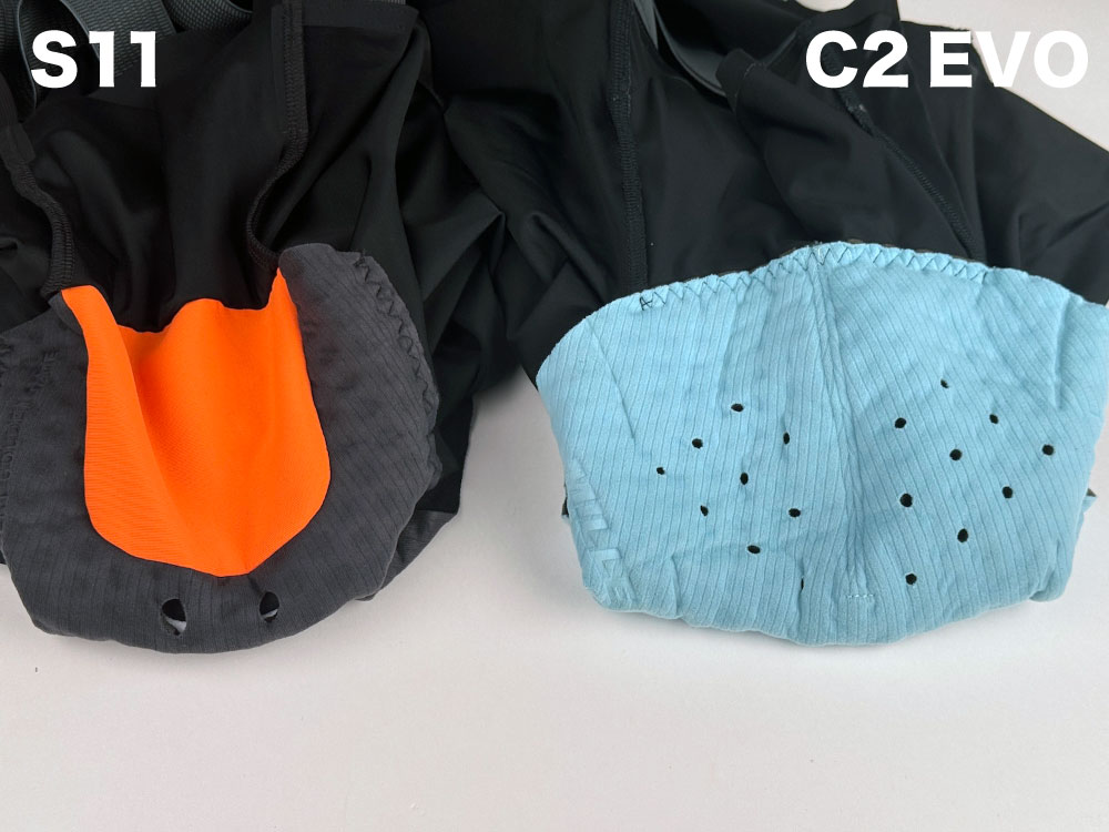 C2 EVOでは後ろ側と前側の2種類の生地でビブストラップが構成されていましたが、S11では後ろ側と前側に2種類計3種類の生地が使用されています。