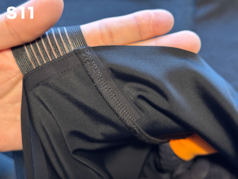C2 EVOでは伸縮性の少ないバンドで固定し、細かなシリコンドットでズレを防いでいましたが、S11からはショーツと同じように柔らかな生地をバンドに使用し、よりグリップ力の高いシリコンドットが五角形状に配置されズレを防止します。