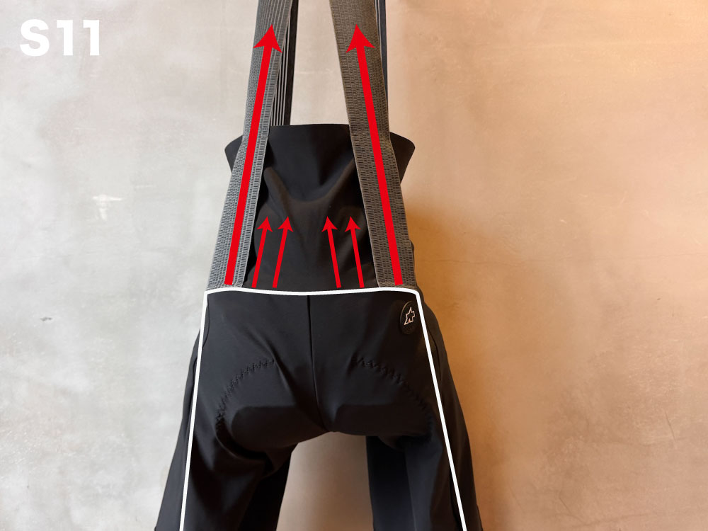 またストラップの固定方法も変化。C2 EVOではストラップの端を三角形にショーツ上部の少し下に固定。さらにウエストにスタビライザーを入れることでショーツを引き上げていましたがS11では、ショーツ上部と並行に固定し、裏側から斜めのスタビライザーでサポートすることでショーツを引き上げます。