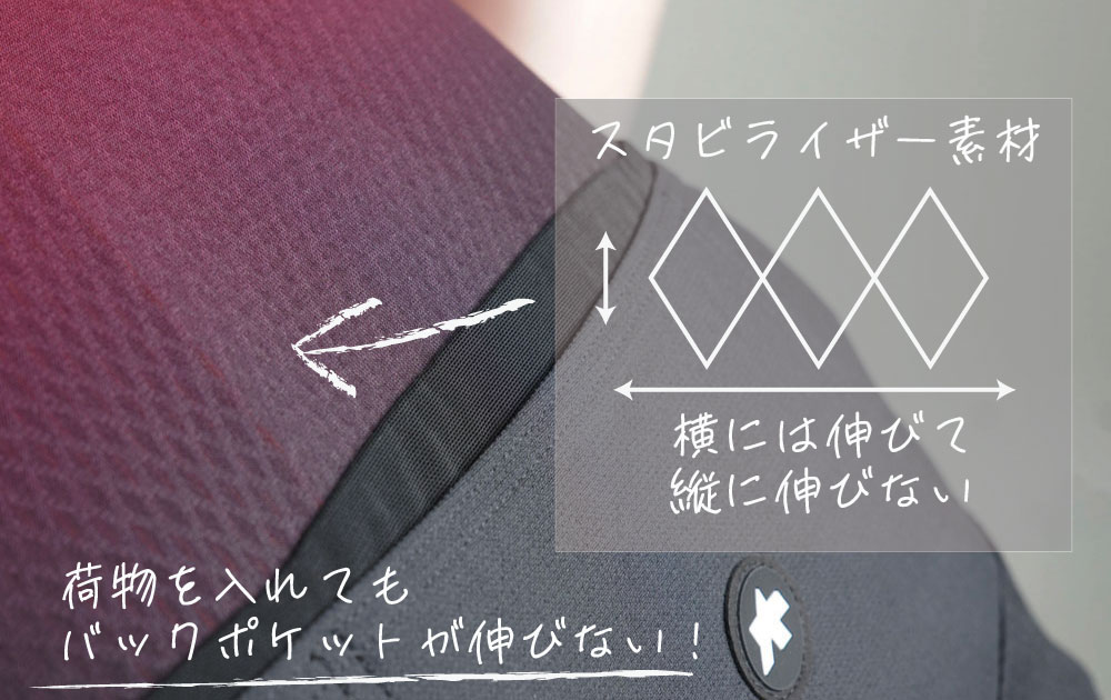 荷物を入れても背面の生地が伸び切らないよう工夫されており、長時間のライドでも安心して使えます。